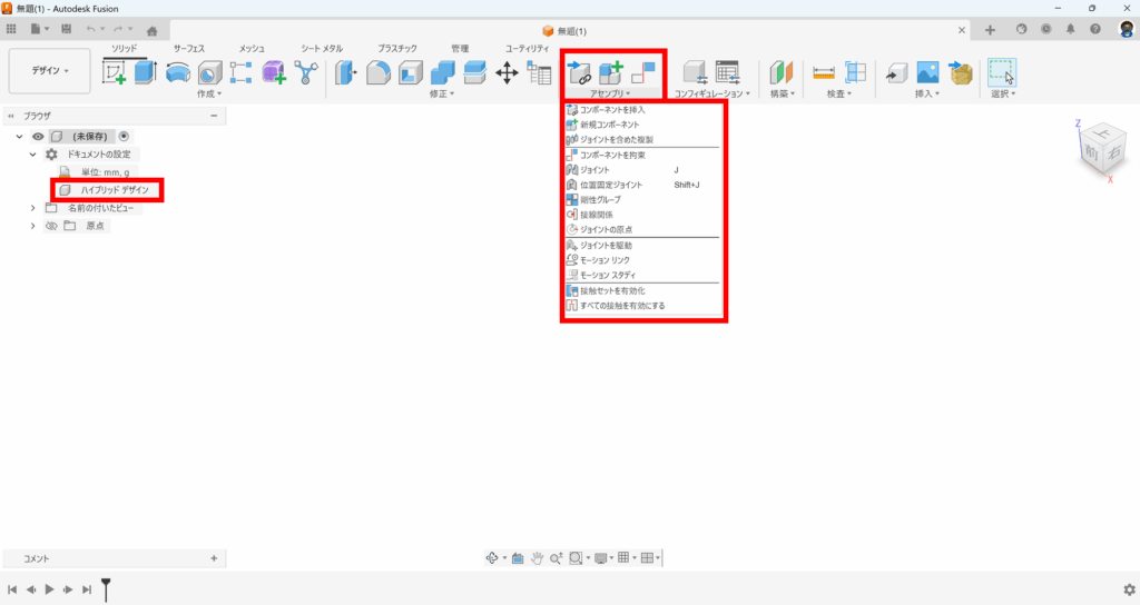 アセンブリデザインを選択した場合には、アセンブリに関する機能のみが使用できる環境となります。ジョイントやコンポーネントを拘束を利用して部品を組み立てていくことができます。