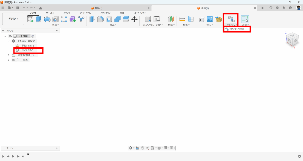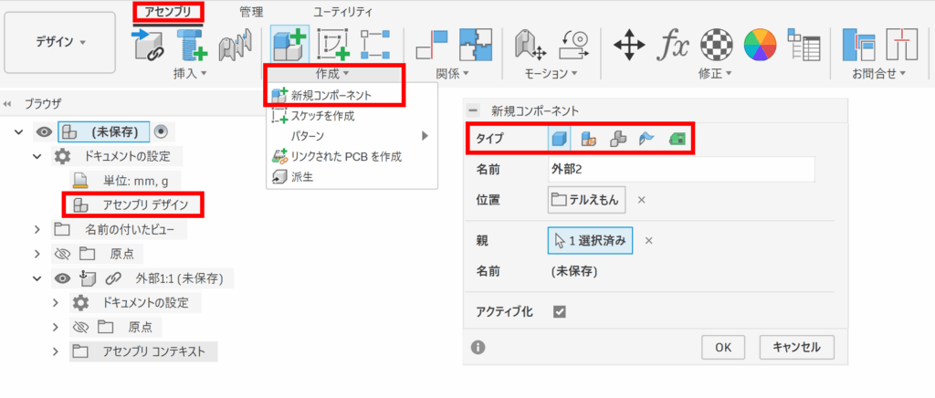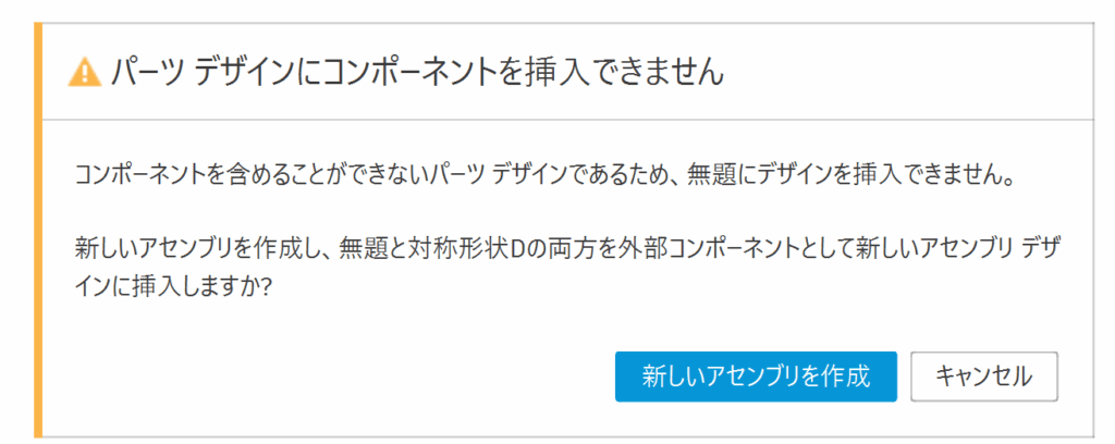 パーツデザインを選択した場合は、1個のコンポーネント(部品)のみが作成できる仕様となり、アセンブリ機能は使用できません。代わりに「アセンブリに追加」というボタンがあります。