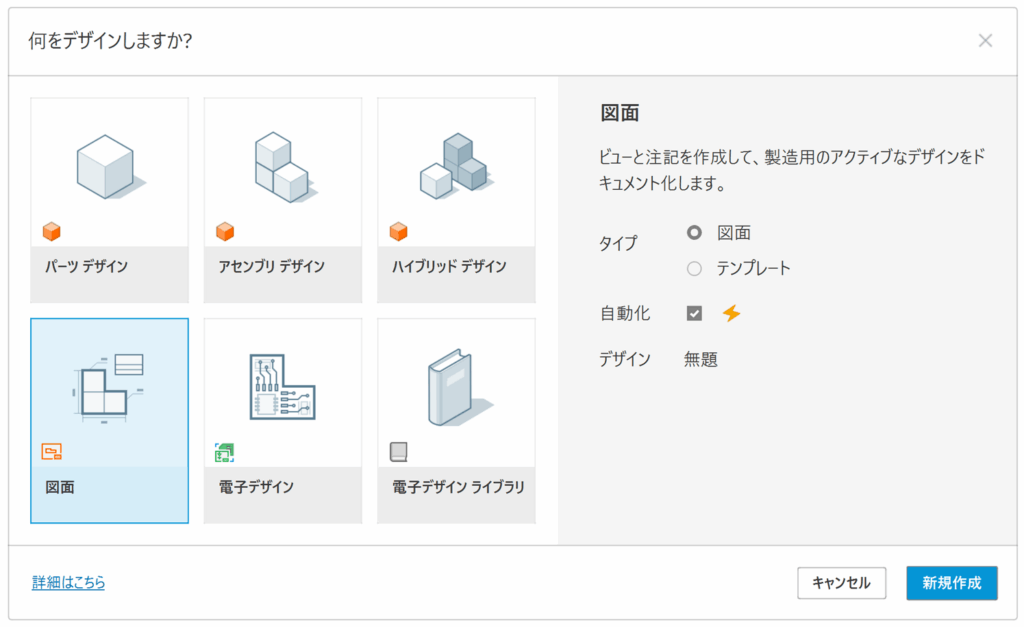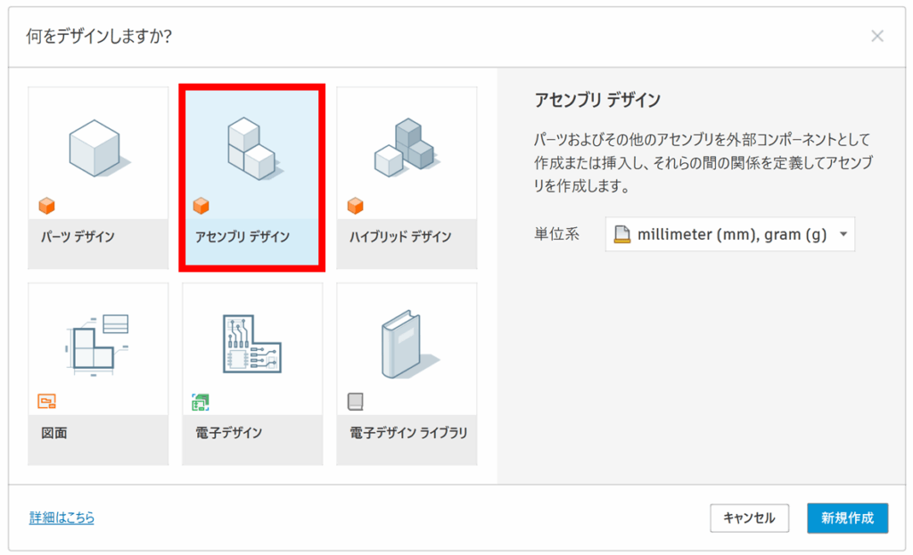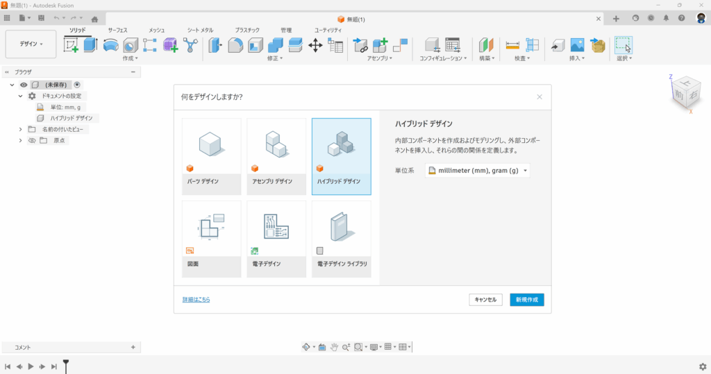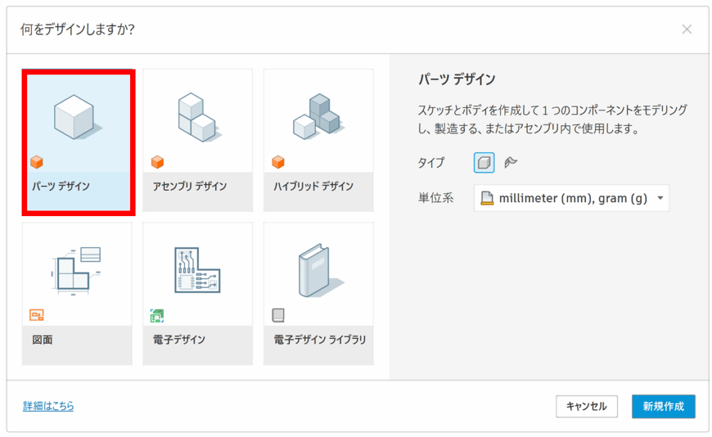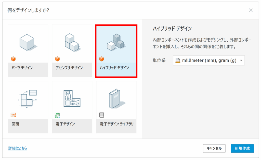 部品作成とアセンブリの両方を行いたい場合には、「ハイブリッドデザイン」を選択してください。