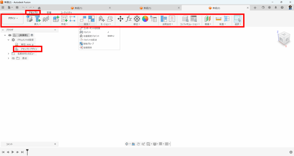 アセンブリ作業をしたい場合には、「アセンブリデザイン」を選択。