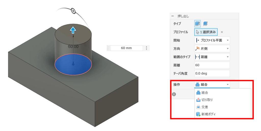 また、形状を押し出しなどで作成する際に、「新規コンポーネント」の選択肢がありません。これは、パーツデザインでは、作成できるコンポーネントが1個のみだからです。